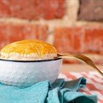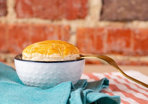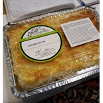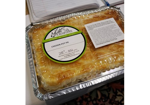 SOLD FROZEN- Fully cooked, simply defrost overnight and reheat in the microwave or oven. Made with tender chicken, onions, carrots, celery, corn and sweet peas in a homemade chicken gravy, topped with a puff pastry crust. The tray weighs a minimum of 28 ounces and serves 2-3.