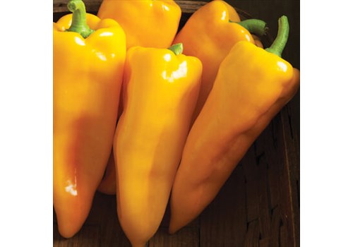 Delicious yellow Italian frying pepper. The golden-yellow counterpart to lovely 'Carmen' and a refined take on the popular Corno di Toro (or "Bull's Horn") pepper class. Intoxicating sweetness any way it is prepared, but traditionally used for frying. Broad-shouldered with an attractive taper. Fruits avg. 6" long x 2-2 1/2" wide. plastic free pot