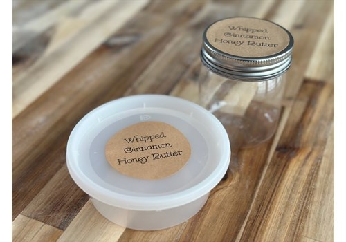 8 ounces of whipped cinnamon honey butter. Choose from a plastic deli container or our plastic screw top mason jars.