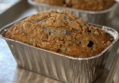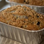 A teacake loaf of blueberry bread with a light streusel crumble on top